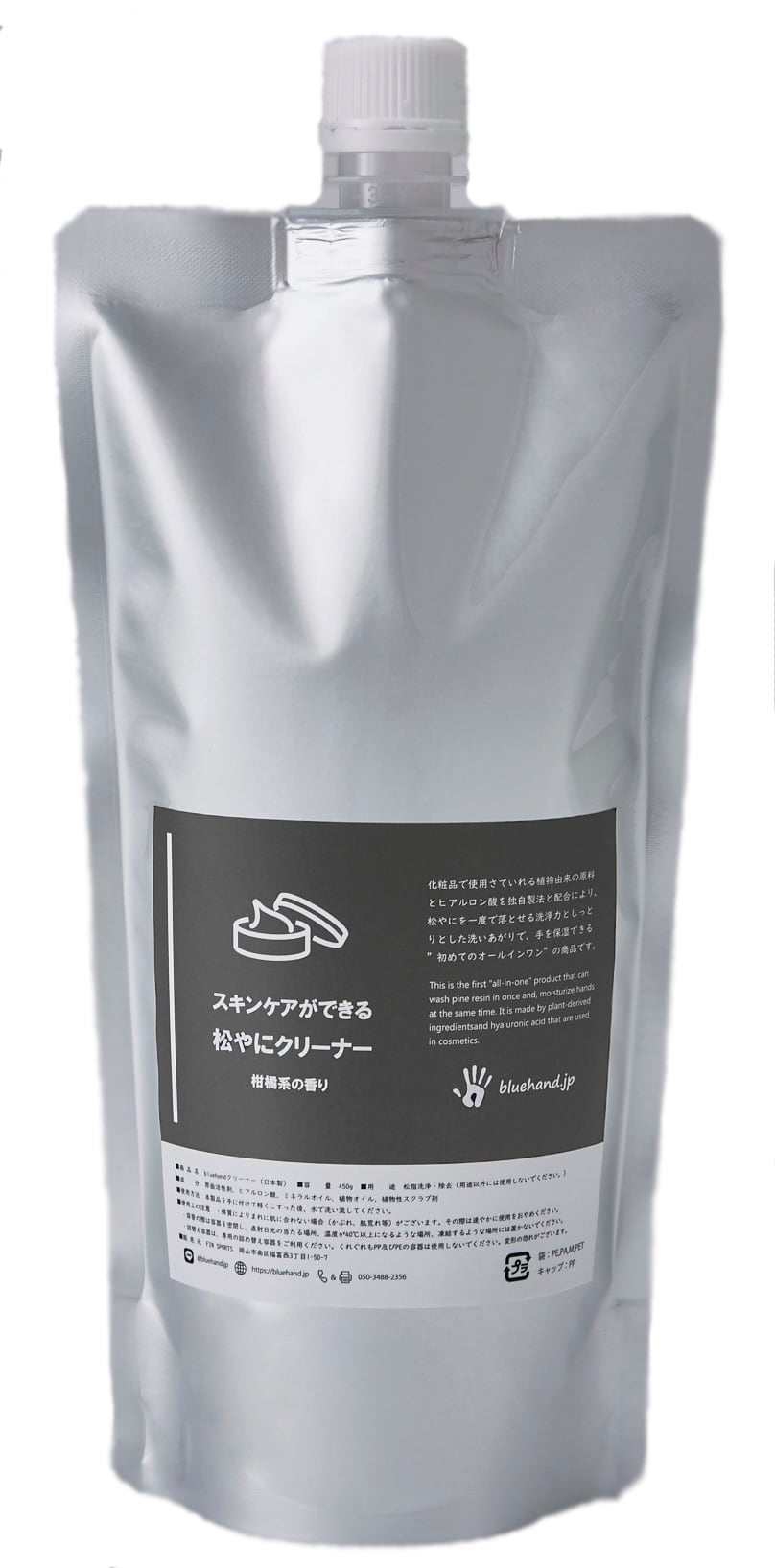 bluehandの原料はすべて化粧品で使用できる成分でできており、一度で落とせる洗浄力としっとりとした洗い上がりで手を保湿できる”初めてのオールインワン”クリーナーです。